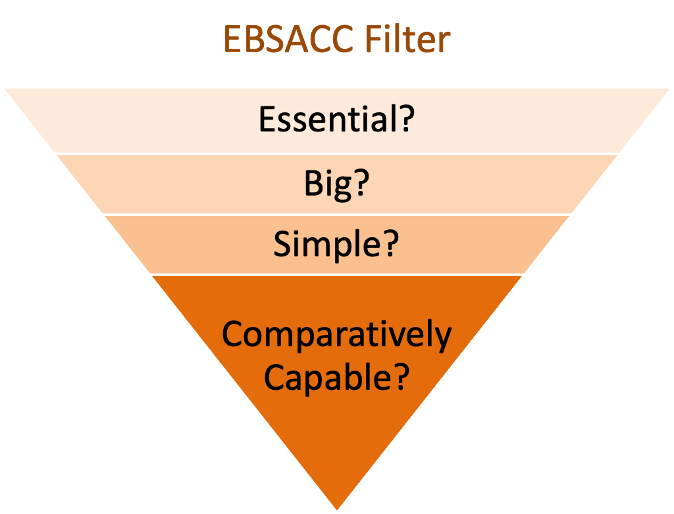 In what I call the EBSACC filter—Essential, Big, Simple, and Comparatively Capable—it’s worth noting how much work that little word “and” is doing. Unless the answer to all four of these questions is “yes,” we should default away from expecting government to take primary responsibility for its provision and instead look first to the coordinating capacities within markets and civil society.
